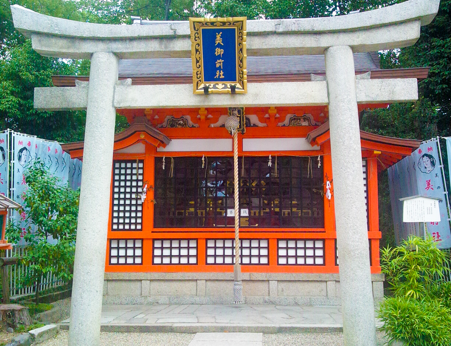 八坂神社の美御前社には、多岐理毘売命(たぎりびめのみこと)、多岐津比売命(たぎつひめのみこと)、市杵島日売命(いちきしまひめのみこと)が祀られています。美容祈願のご利益があり、美容水と呼ばれる御神水が湧きだす美御前社は重要文化 です。