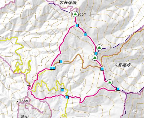 上日川峠→雷岩→大菩薩嶺→雷岩→賽の河原→大菩薩峠→石丸峠→石丸峠入口→上日川峠