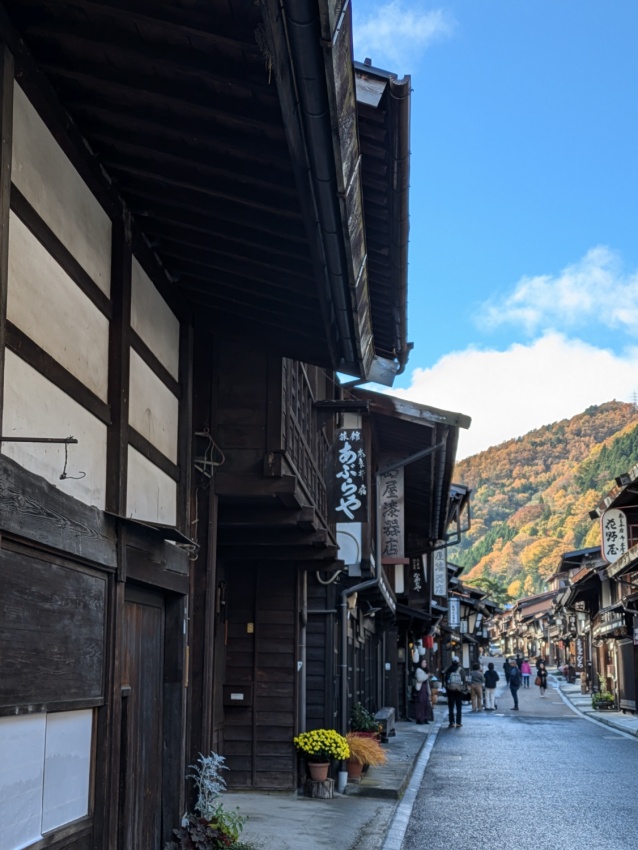そして、秋の奈良井宿は特別です。背後の山々が錦繍に染まり、深紅や黄金色の紅葉が宿場町を華やかに彩ります。黒光りする木造の町並みと紅葉のコントラストは、まさに絵巻物のような美しさ。歩を進めるたびに、古き良き日本の原風景が鮮やかな色彩とともに目の前に広がります。