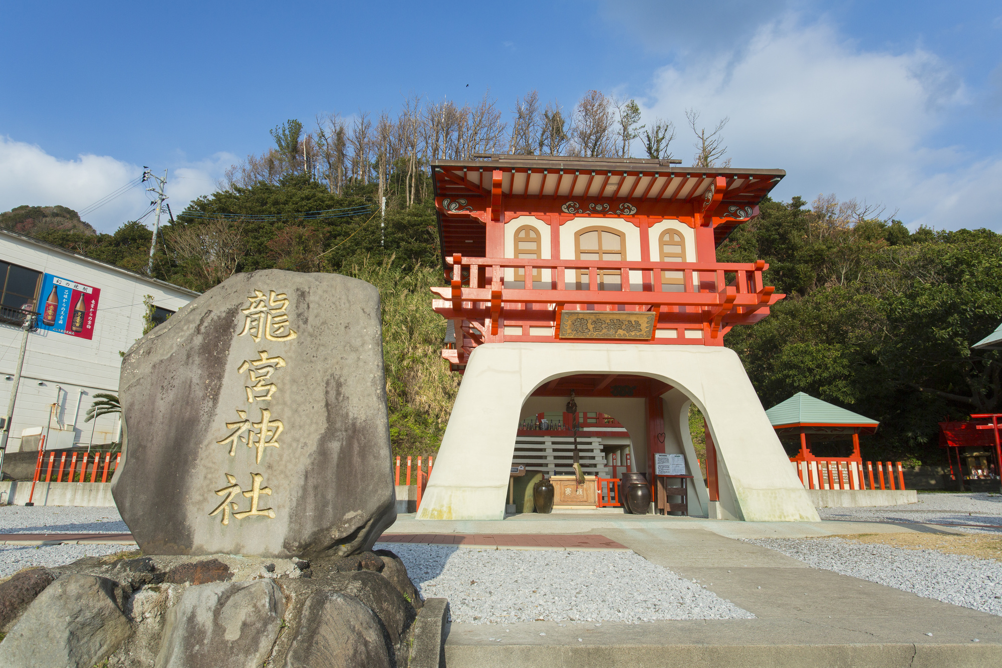 まるで竜宮城に訪れたかのような白と朱色の楼門に、青い海という絶景もご覧頂けます。