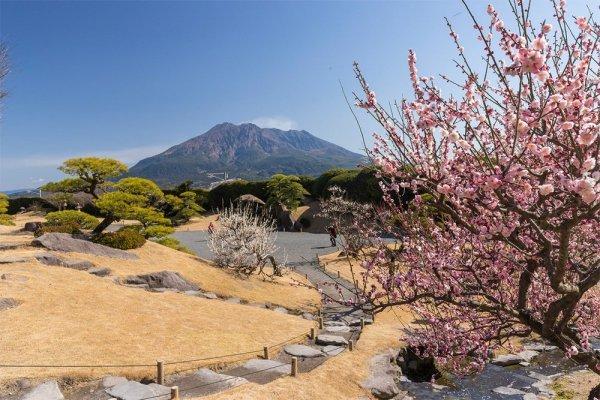 万治元年(1658)に島津家19代光久によって築かれた島津家の別邸です。雄大な桜島を築山、錦江湾を池に見立てたスケールの大きな庭園で、28代斉彬もこよなく愛し、篤姫など多くの人を魅了しました。