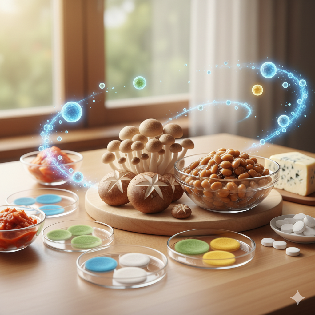 菌というと…納豆、キノコ、チーズ、味噌、醤油、パン、日本酒、ビールなどなど、私たちの食生活に欠かせない美味しいものがイメージされます。腸内環境を整えるなど、私たちの健康維持に重要な役割を果たしています。