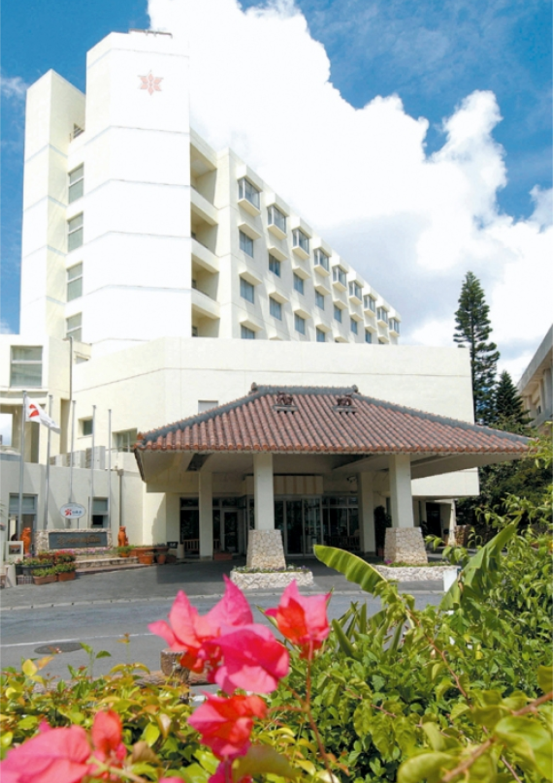 ホテルは白を基調とした建物で、沖縄らしい赤瓦屋根の玄関がアクセントとなっています。ホテル正面からは石垣港や八重山の青い空が望め、夜にはライトアップも見られる大型ホテルです。
