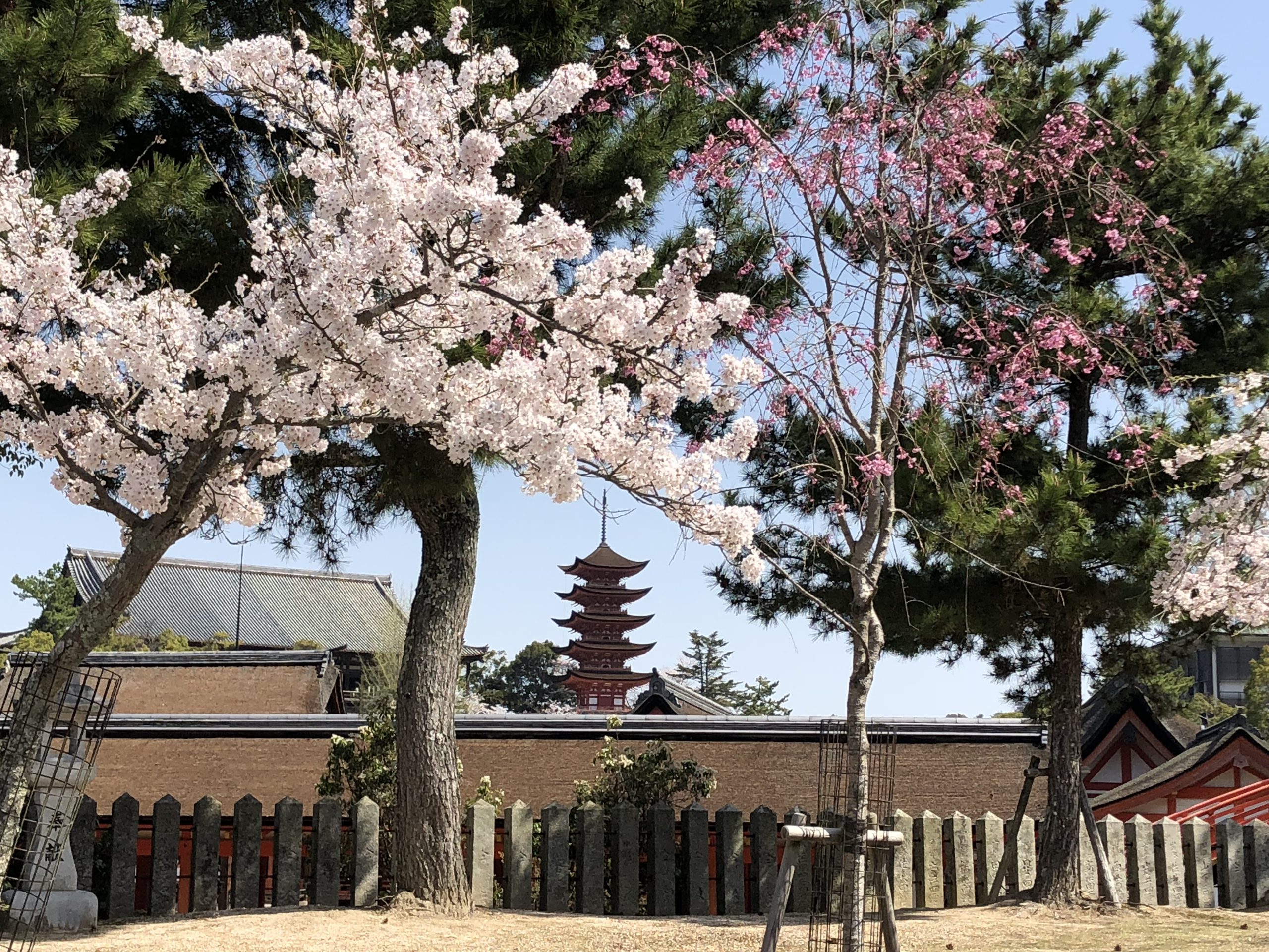 宮島随一の絶景スポット「多宝塔」の周辺に桜が多くあり、桜と多宝塔、青い海と美しい光景をご覧頂く事が出来ます。