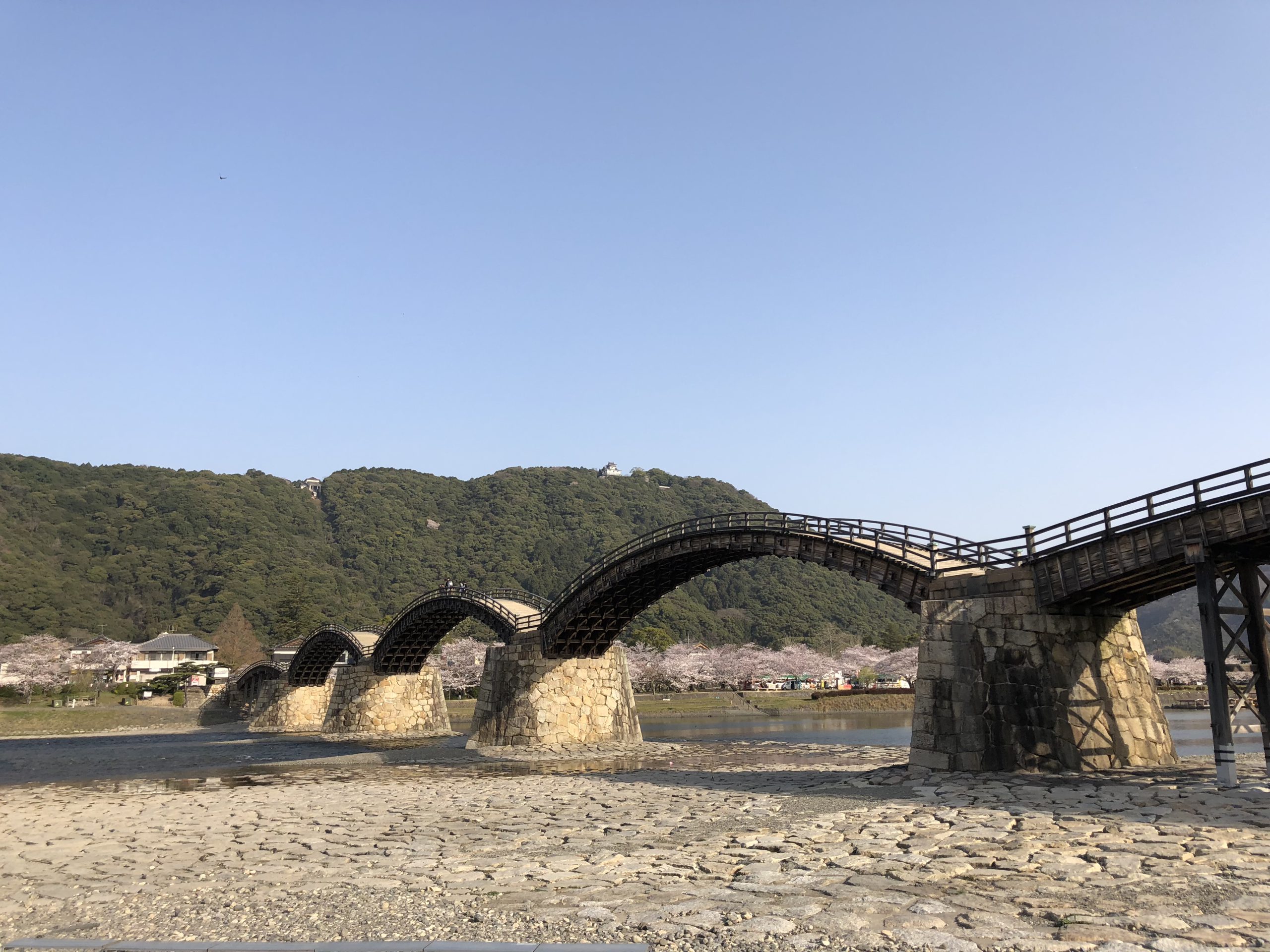 山の上には岩国城も見え、橋と桜とお城の美しい光景をご覧いただけます!