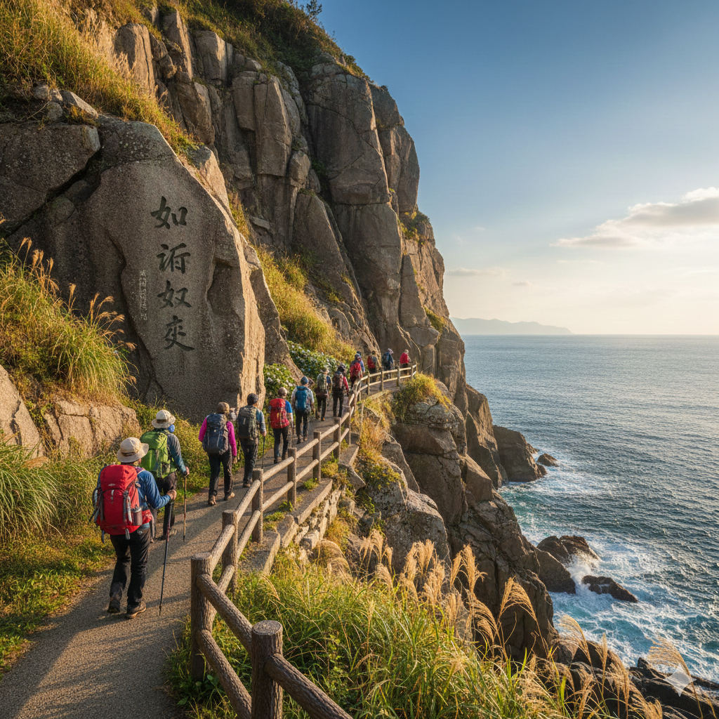 現在は遊歩道となっており、足がすくむような高さから日本海を見下ろすことができます。かつての旅人が命がけで波打ち際を駆け抜けた時代から、明治時代に崖を削って道を拓いた歴史を肌で感じられます。