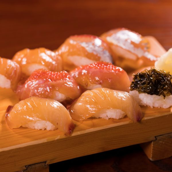 近海で獲れた旬な魚の寿司種を醤油ベースのタレに漬けてヅケにし、シャリはやや甘めの酢飯で握り、ワサビの代わりにカラシを載せてあるのが特徴の郷土料理です。