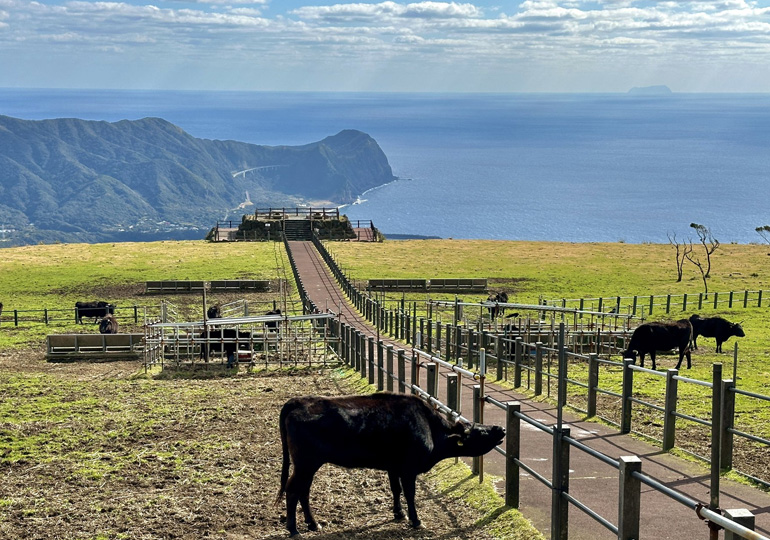 八丈富士の7合目にある牧場です。緑が広がる牧草地の中には、遊歩道が整備されていて、のんびり暮らす牛たちの風景をみることができます。上の写真のちょうど反対側も絶景で、よく観光パンフレットなどでも使われている場所です。