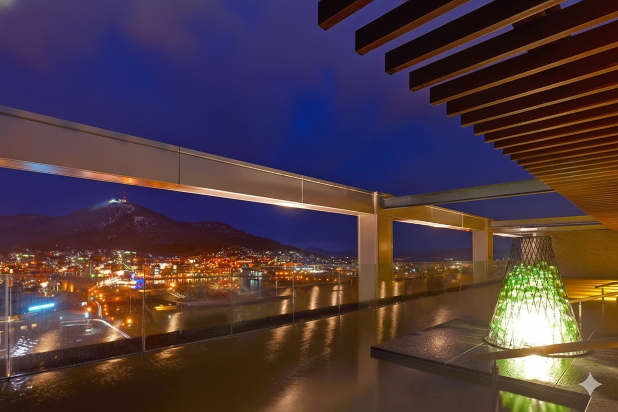 屋上にある「天空露天風呂」は、函館山や夜景を一望できる絶景スポット。お湯が縁から溢れ出す造りは、まるで景色と一体になったような感覚になれます。