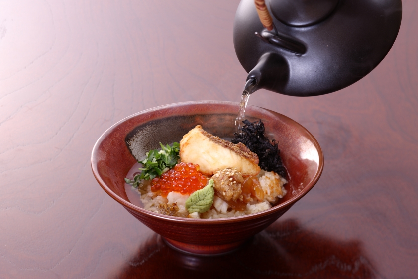 新潟産のコシヒカリを鯛めしに!そこに焼いた鯛の身、三つ葉、とびっこ、柏崎産もずく、岩のり、山葵、しそのみ、そして最後にあつあつの鰹のだし汁をかけた極上の鯛茶漬けです!!