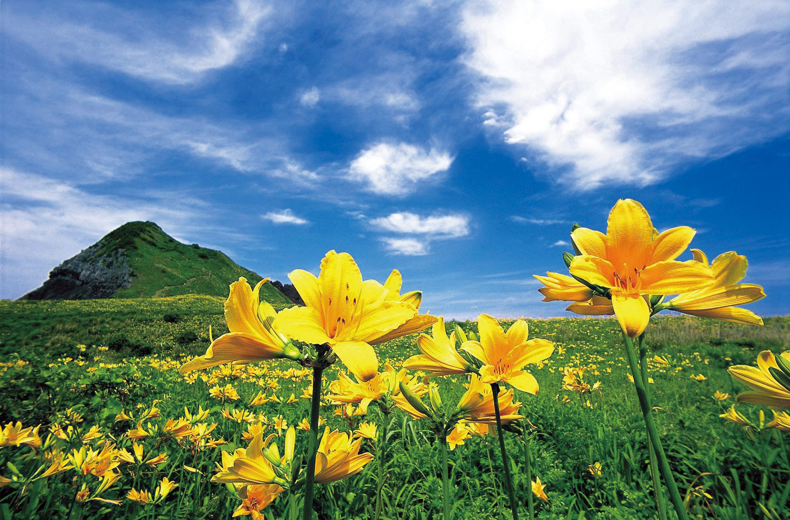 紺碧の海と巨大な岩塊を背景に、数百万輪のトビシマカンゾウが咲き誇る黄金の絶景。