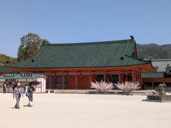 4月の平安神宮は、まさに「地上の楽園」。広大な名勝「神苑」では、空を覆うほど見事に咲き誇る「紅しだれ桜」が、朱塗りの社殿に美しく映えます。